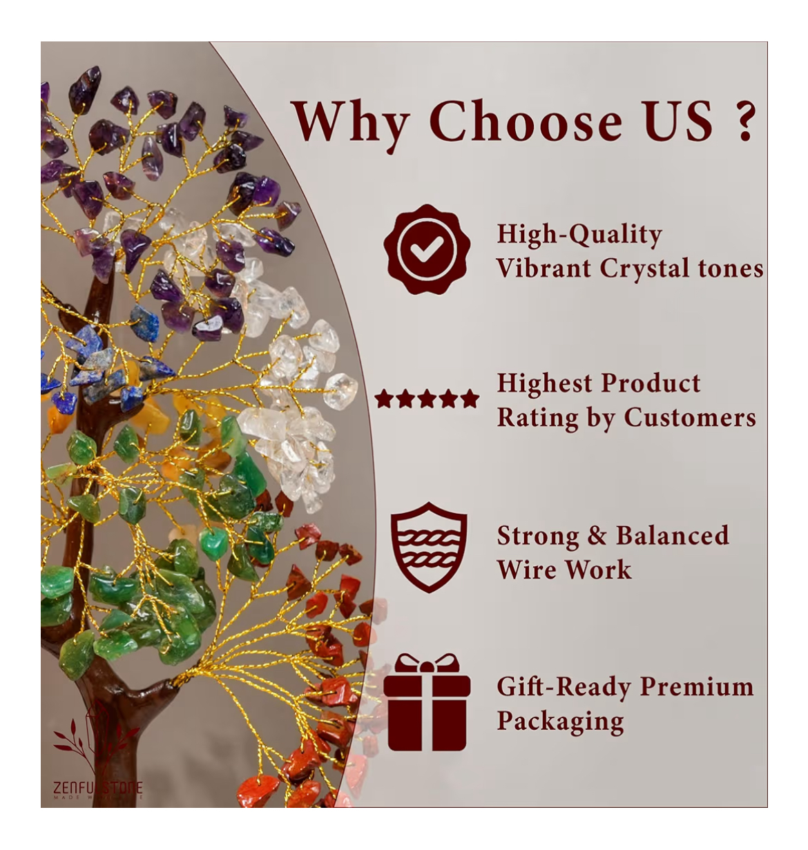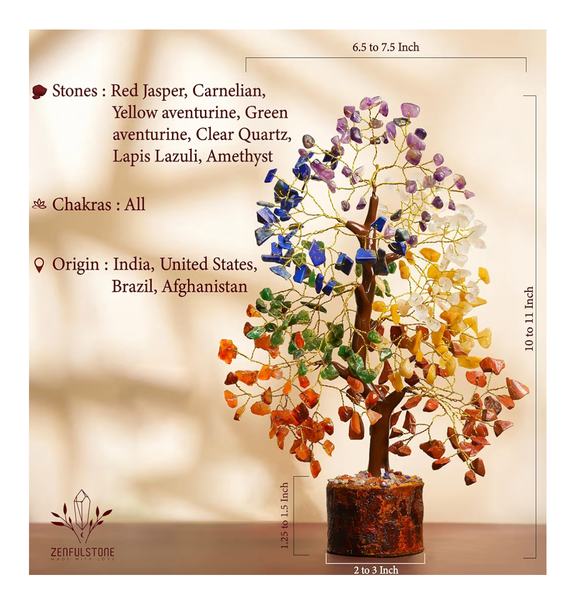 Materials: Genuine chakra crystals, golden metal wire, wooden base