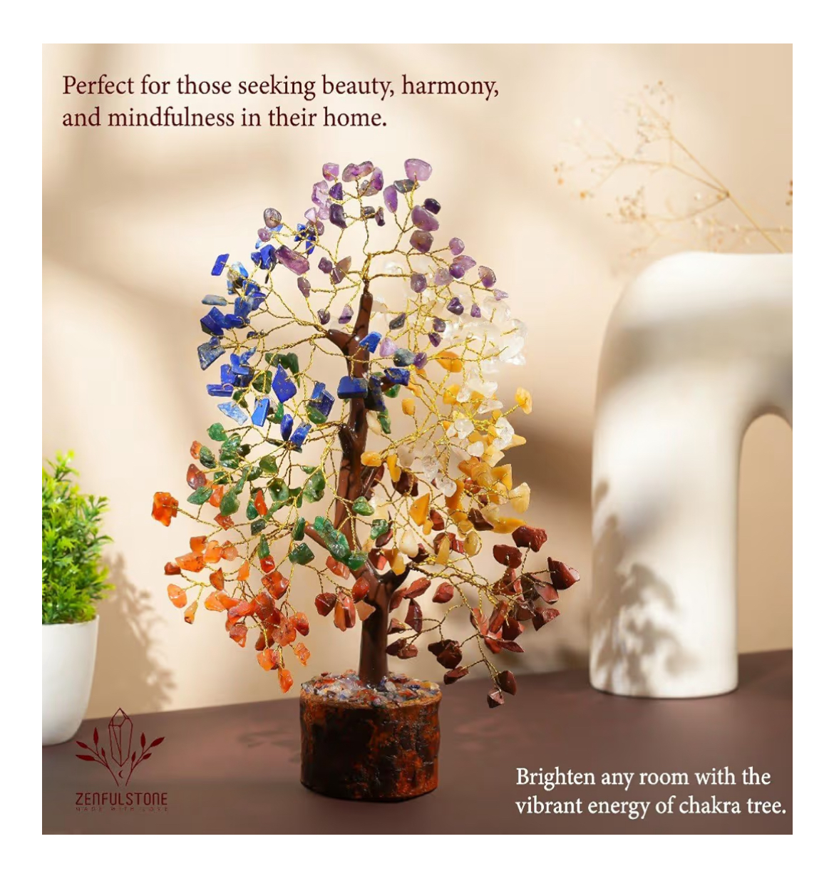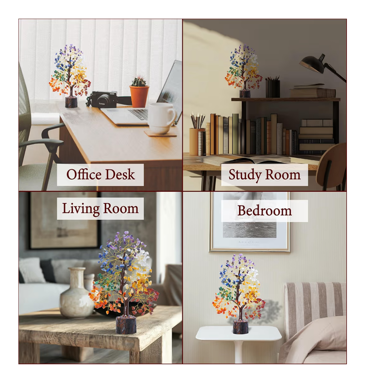 This Feng Shui-approved crystal bonsai serves as both a meaningful décor piece and an energy amplifier. Its golden metal wire branches and solid wooden base add elegance to any setting — from your living room or meditation space to your office desk or bookshelf.