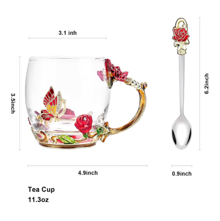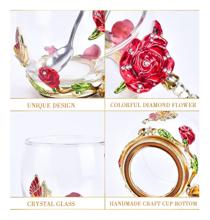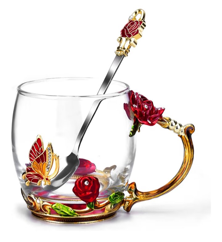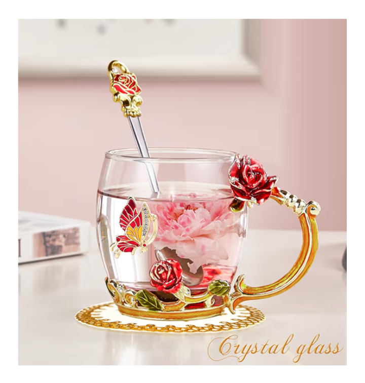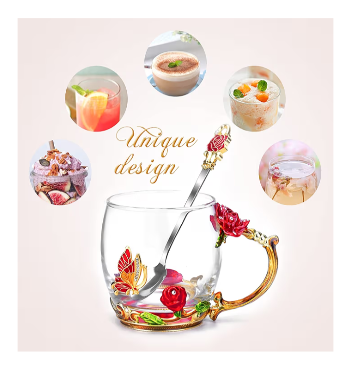 Add a touch of luxury to her daily routine with this beautifully handcrafted enamel glass mug, designed to inspire warmth and elegance with every sip. The sparkling glass cup features intricate 3D butterfly and red rose accents, blending artistry with functionality. Perfect for morning coffee, afternoon tea, or display as a decorative piece.